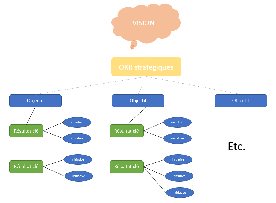 Les OKR stratégiques sont définis par la direction, sur la base de la vision et décrivent les grandes missions de l’organisation, ils sont souvent des objectifs de haut niveau qui reflètent les aspirations de l’entreprise et sont essentiels pour sa croissance, sa pérennité et son succès à long terme. Ils sont souvent définis pour une période d’un an ou plus, et sont déclinés avec leurs Key Results pour le trimestre ou le semestre à suivre.